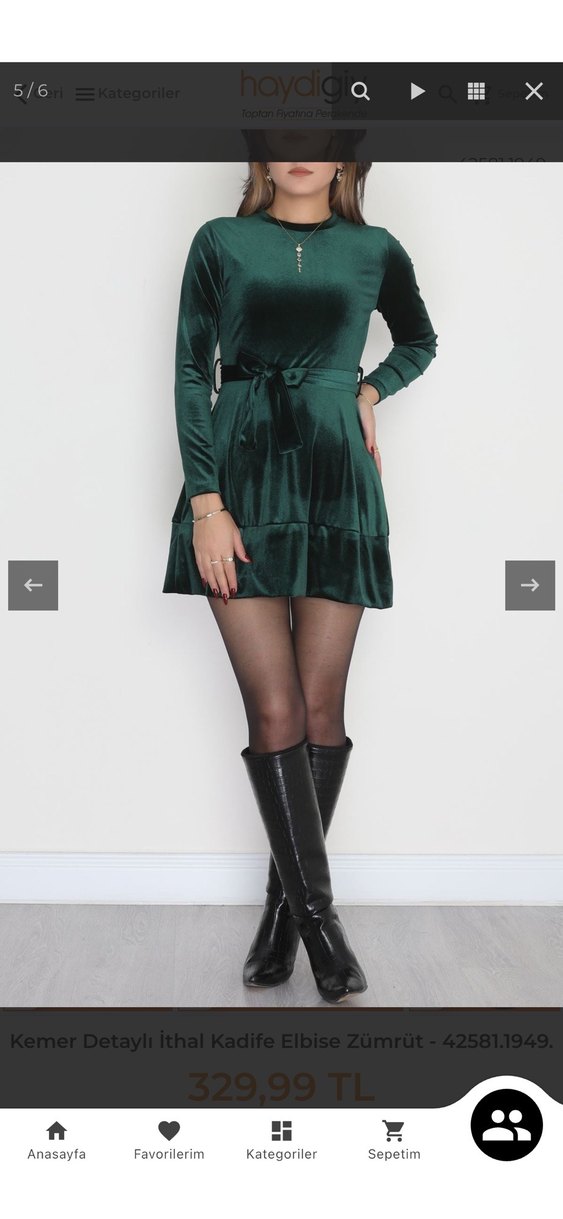Koyu yeşil kadife kumaştan, kemerli ve beli oturan, yüksek yakalı mini elbise. Uzun kollu ve sade şık tasarıma sahiptir. S beden hiç kullanılmamıştır