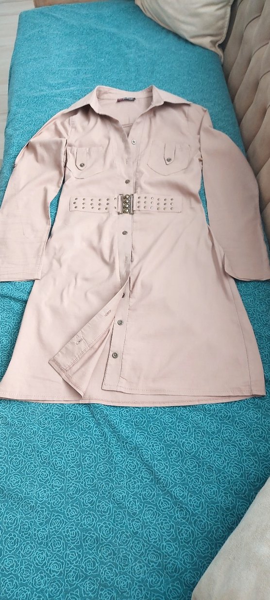 Bej renkli, uzun, kemerli kadın elbise. Çentikli yaka ve uzun kollu, sentetik yumuşak kumaştan, rahat kesim, desensiz tasarım, günlük sokak stili için uygun.Renk sütlü kahve dir