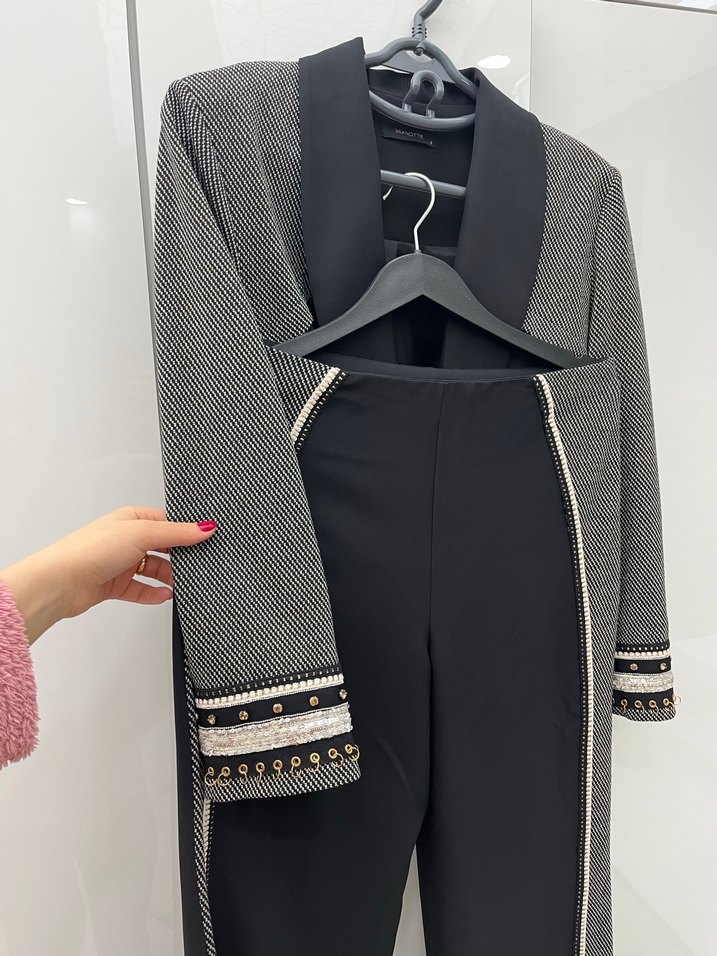 Kadınlar için kemerli, desenli, uzun gri ceket. Notlu yaka ve askılı kollara sahip, ofis kullanımı için uygun sentetik kumaştan yapılmıştır. İnce işlemeli özel gün yemek davet düğün nişan takım
