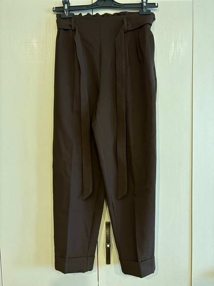 Kemerli bel ve düz kesimle tasarlanmış koyu kahverengi kadın kumaş pantolon. Ofis ve sokak stili için uygun, uzun boy ve sentetik kumaştan yapılmıştır.