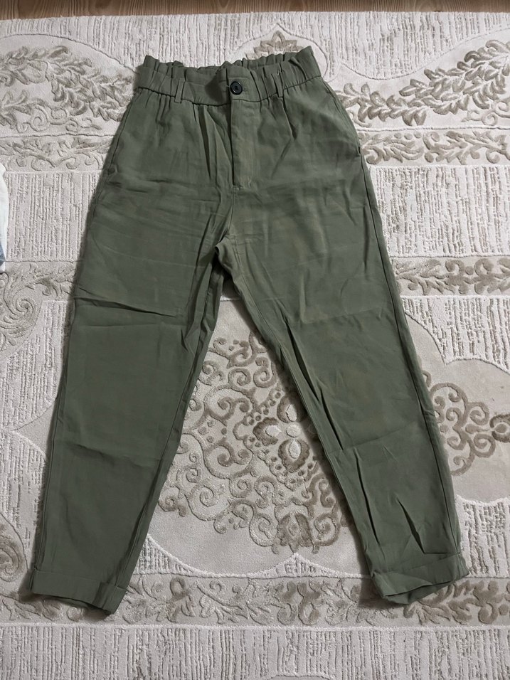 Kadınlar için kemerli, keten kumaştan, haki renk midi boy bol kesim pantolon. Günlük rahat kullanım için uygundur.