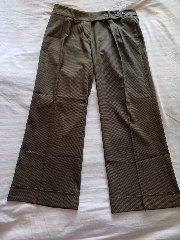 Kemerli, normal boy midi uzunluğunda kahverengi kadın kumaş pantolon. Ofis kullanımı için uygun, normcore tarzda.