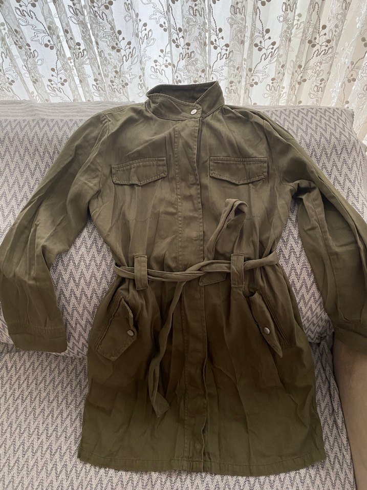 Pamuklu, kemerli bel, uzun kollu, çıtçıtlı yaka detaylı, salaş kesim, haki renk midi ceket. Rahat ve günlük kullanıma uygun.
