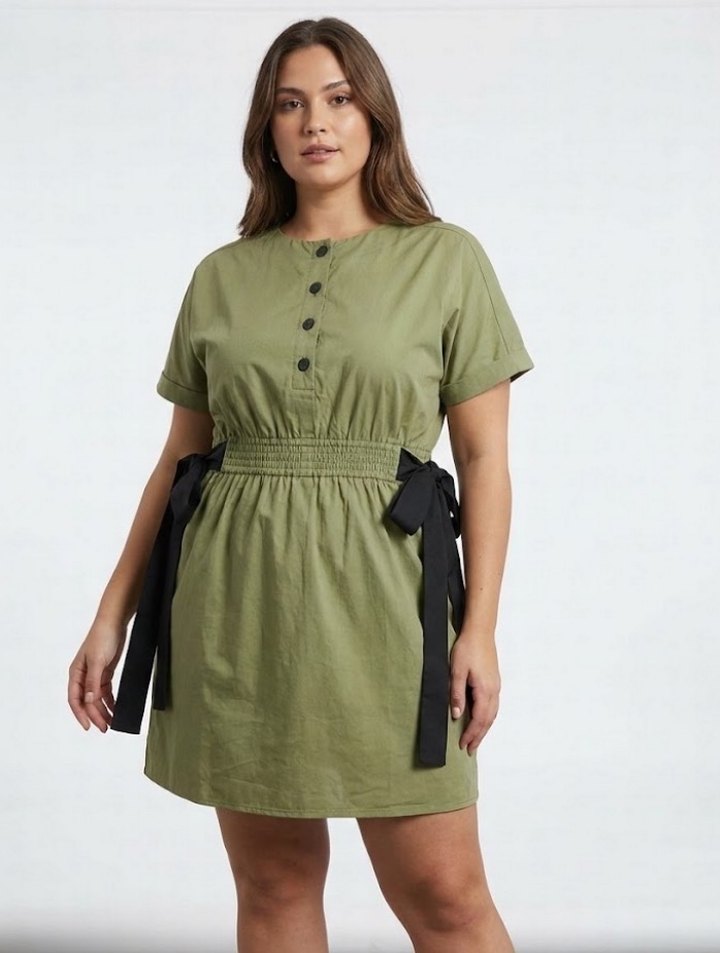 S-M uyumlu .Kemerli, kısa kollu, yuvarlak yakalı, bol kesim keten elbise, günlük kullanıma uygun yeşil renkte.