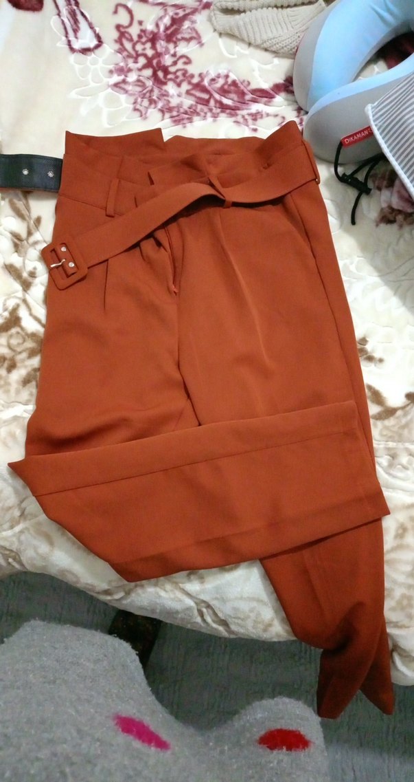 Kemerli, midi boy, kahverengi kadın pantolon. Yumuşak ve ipeksi kumaştan, bol kesimli, günlük ve ofis kullanımı için uygun.
