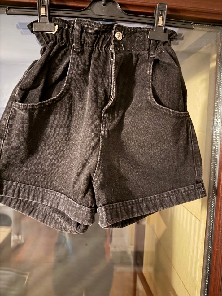 Geniş kesim, kemerli bel ve büyük ön cepleri olan mini denim şort. Günlük rahat sokak stili için uygundur.