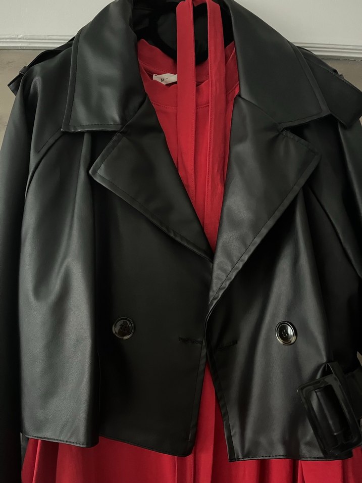 Uzun kesim, siyah deri ceket, kemerli ve yakalıdır. Gevşek kesimi ve gotik tarzıyla ofis kullanımına uygundur. Askılı kollara sahiptir.