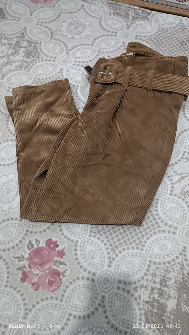 Kemerli bel ve midi boyda, rahat kesim kahverengi süet kadın pantolon. Günlük kullanıma uygun, şık ve rahat sokak stili.