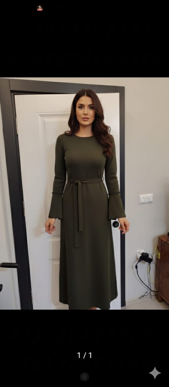 Kemerli, uzun kollu ve haki renkte kadın elbisesi. Sentetik kumaştan, sade ve günlük kullanım için uygun bir tasarıma sahiptir.