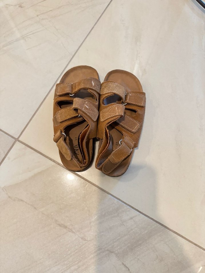 Kemerli, parlak kahverengi deri erkek çocuk sandaletleri, klasik ve geleneksel bir tarza sahiptir. zara marka 27 numara
