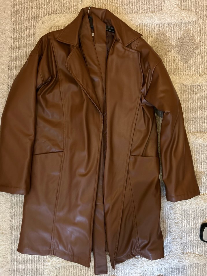 Kemerli, kahverengi deri kadın ceket. Notlu yaka ve uzun kollu, parlak yüzeye sahip, günlük kullanım için uygun.