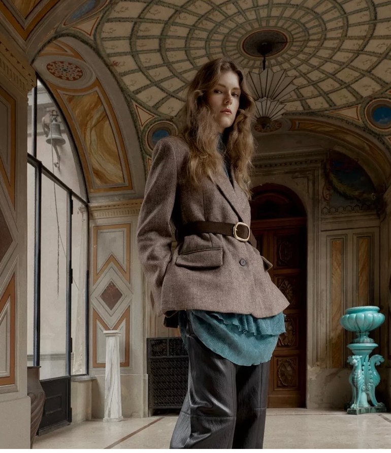 Kahverengi keten kumaştan, kemerli ve normal kesim olan bu blazer, uzun kollu ve yakalıdır. Midi uzunlukta, desen içermeyen, günlük kullanıma uygundur.