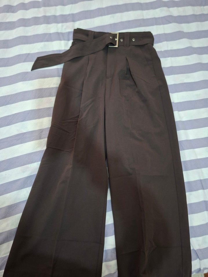 Kemerli bel ve normal kesime sahip kahverengi kadın kumaş pantolon. Midi boy, sokak tarzı, günlük kullanıma uygun. ✨