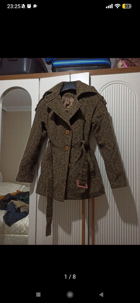 Kahverengi yünden yapılmış, kemerli ve kısa boyda, günlük sokak stiline uygun rahat kesim kaban. Simli bir yansima var içinde çok şık. Belden oturan ve kalın kışlık bir kaşe kumaşı var. Toplasan bir kaç kez giyildi 36_38_40 bedene rahat olur
