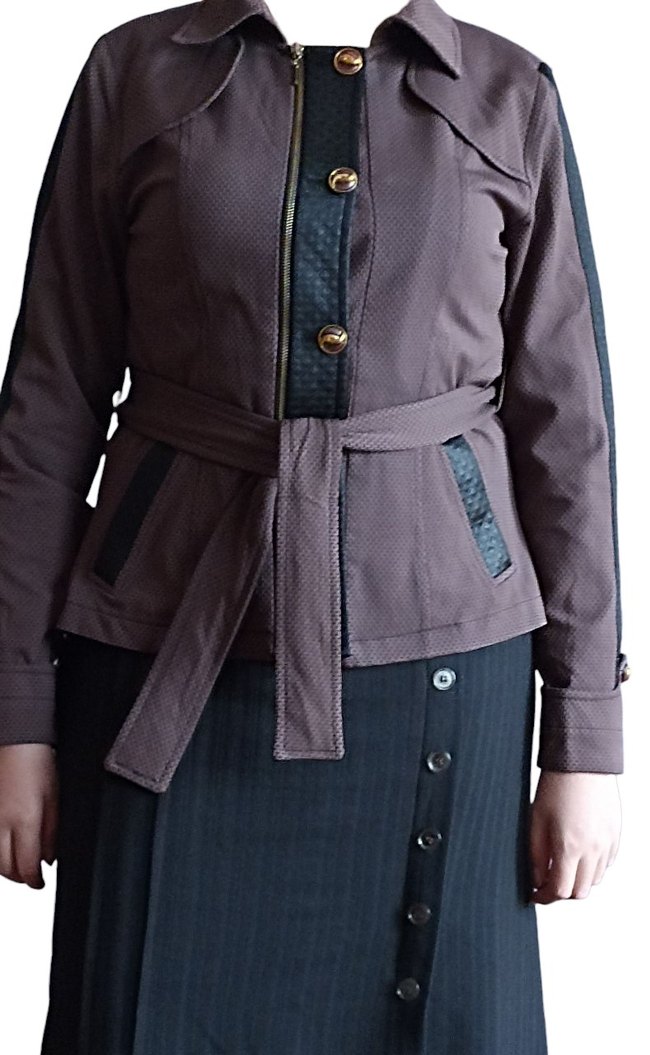 Kahverengi, kemerli, normal uzunlukta midi kadın ceket. Uzun kollu, kesimli yakalı ve düz desensiz, günlük kullanım için uygun.