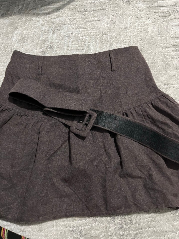 Kemerli bel kısmı ile bol kesim kahverengi keten mini etek. Günlük kullanıma uygun, desen içermeyen sade tasarım. Sadece bir kere giyildi