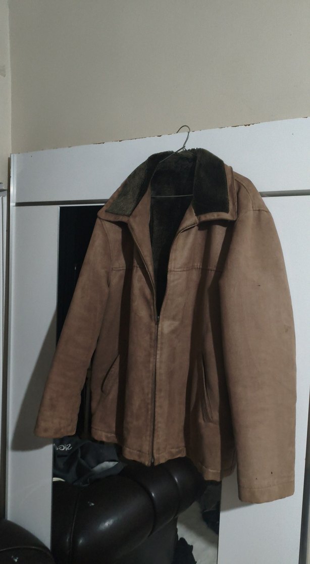 Kahverengi süet kumaştan, kemerli ve notched yaka detaylı, bol kesim erkek ceket. Uzun kollu ve günlük kullanıma uygun.