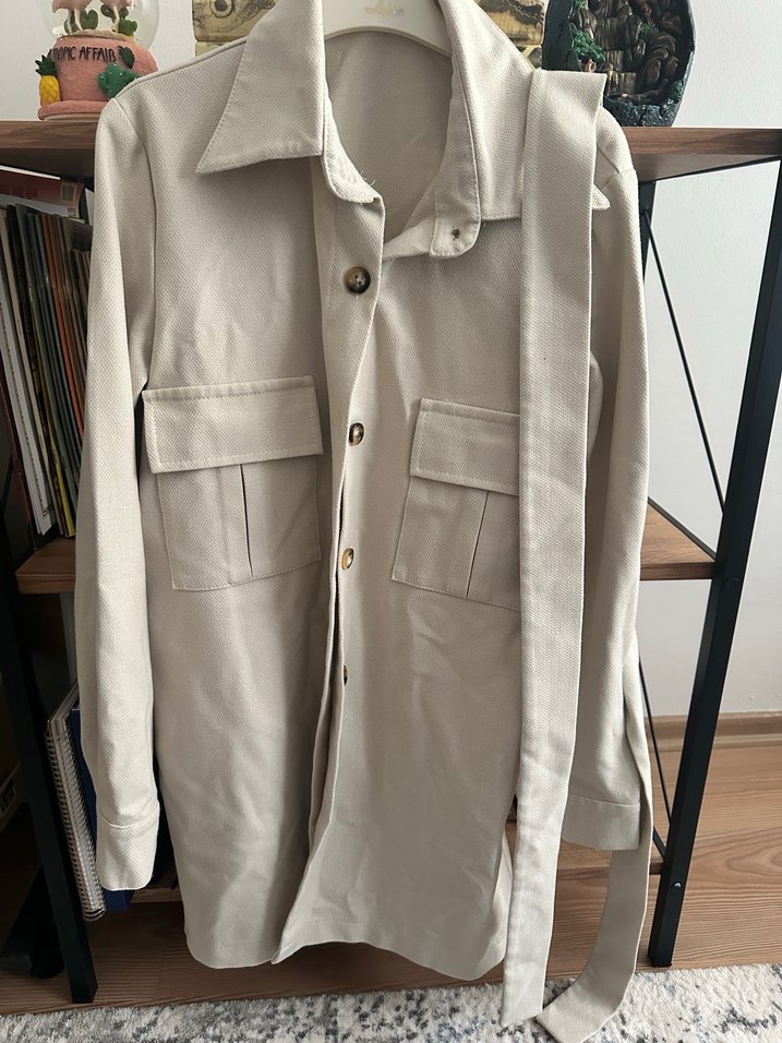 Bej renkte, düğmeli ve uzun kollu midi kadın ceket. Keten kumaştan, regular fit ve çentikli yaka detaylıdır. İki ön cep ve kemer içerir.