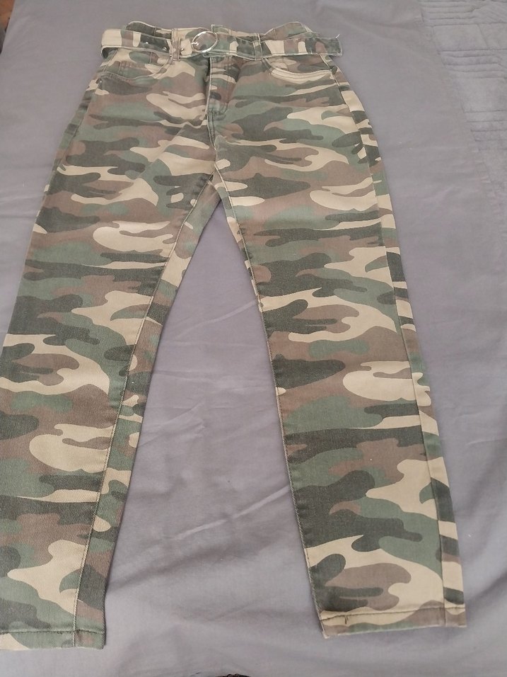 Kemerli, kahverengi ve gri kamuflaj desenli kadın kumaş pantolon. Normal uzunlukta, midi boyda ve sentetik kumaştan üretilmiştir, dış mekan kullanımı için uygundur.