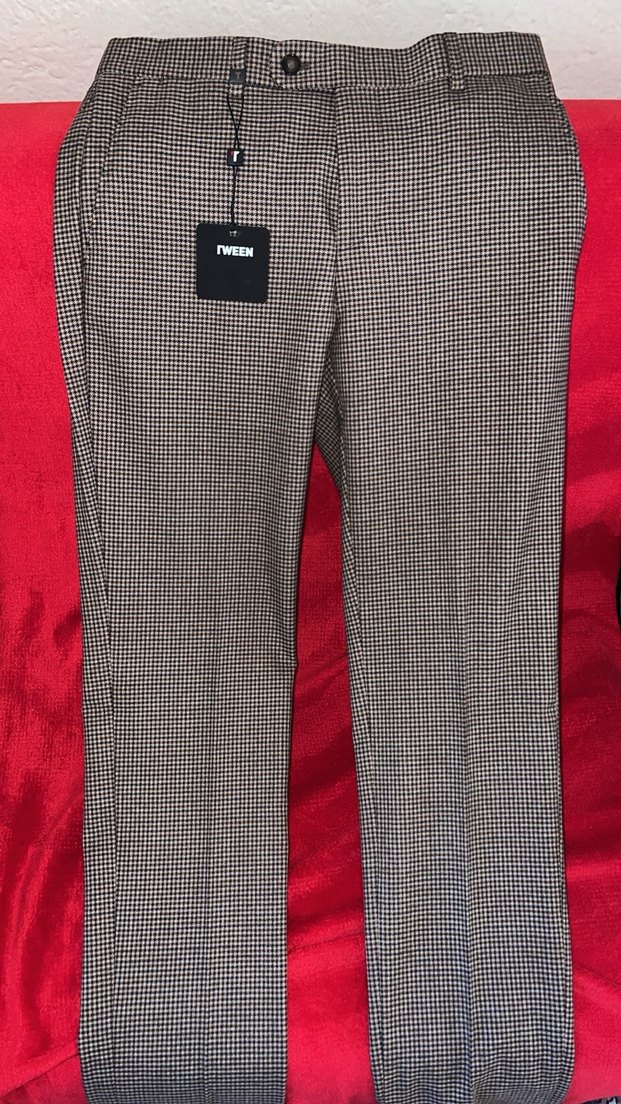 Kemerli, kareli desende gri ve kahverengi tonlarda, normal boy midi erkek kumaş pantolon, ofis kullanımı için uygundur.