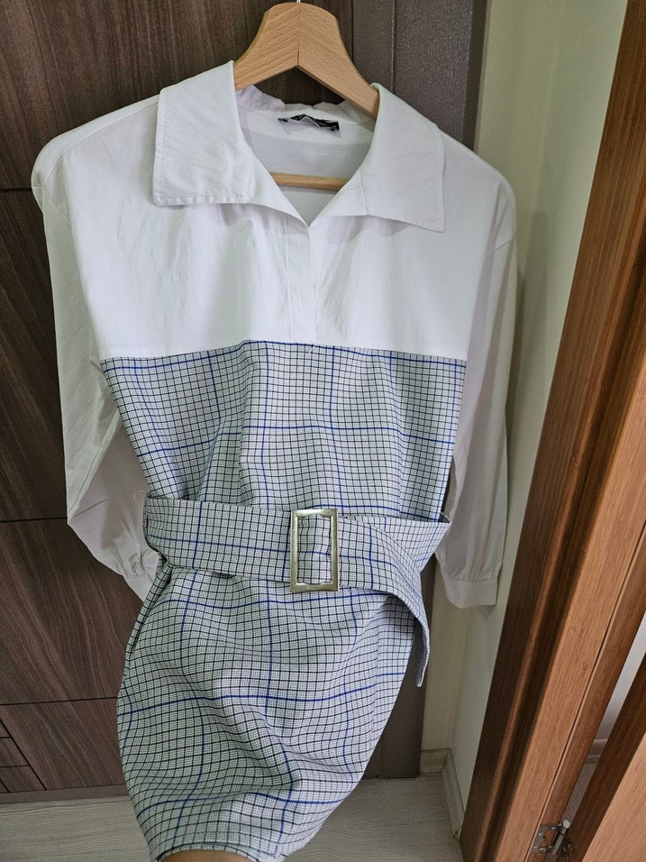 Pamuk kumaştan, beyaz ve gri kareli desenli, yakalı, uzun kollu, kemerli, mini uzunlukta ve regular fit kesime sahip kadın gömlek.