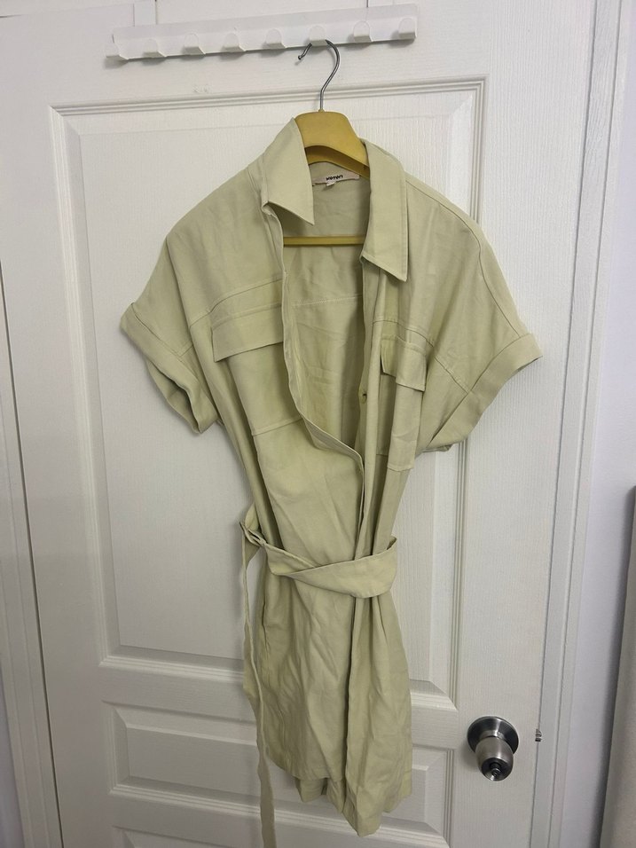 Kemerli, kısa kollu ve yakalı keten kadın elbise Bej renk, rahat ve salaş kesim, günlük sokak stili için uygundur.