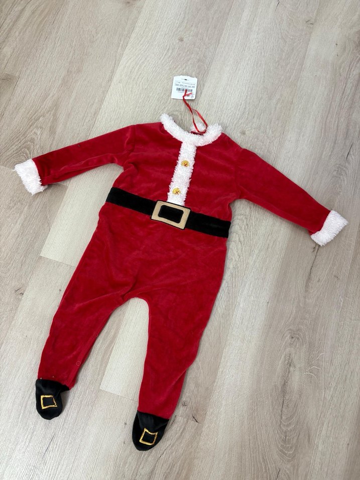 Kemerli, uzun kollu kırmızı bebek tulumu, beyaz yumuşak detaylar ve ayaklarda toka süslemeleriyle Noel kostumu görünümünde. yeni yil bebek tulu 6-12 iki adet vardir unisexdir