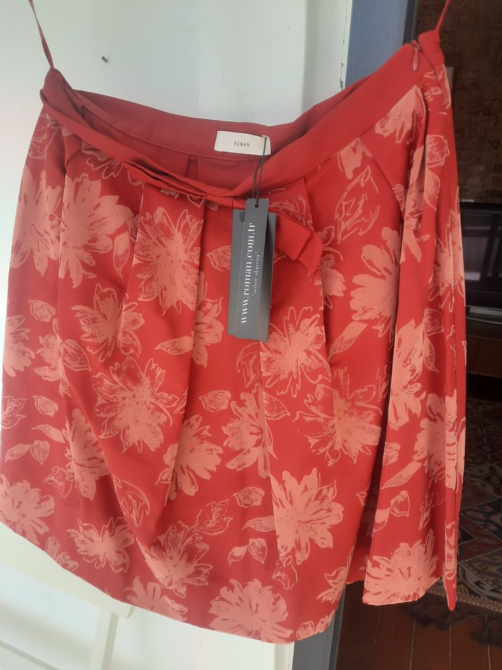 Kemerli, kırmızı çiçek desenli, ince ve akışkan kumaştan yapılmış, bol kesim midi etek. Romantik akşamlar ve iş için uygun.