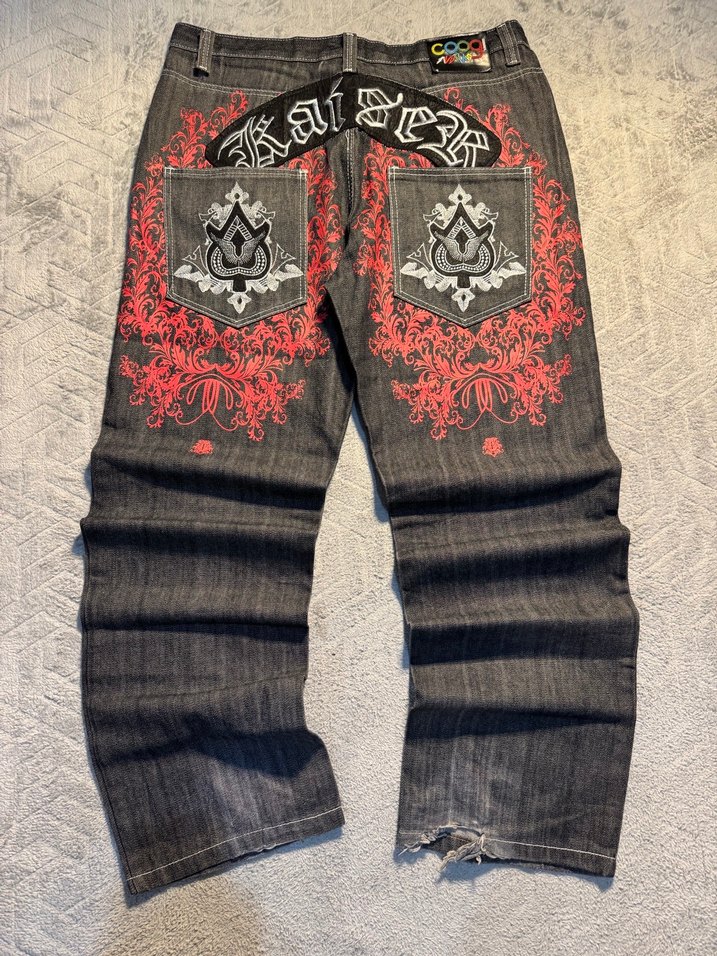 Kemerli, koyu kırmızı desenli kot pantolon, rahat kesim ve arka ceplerle sokak stiline uygun.