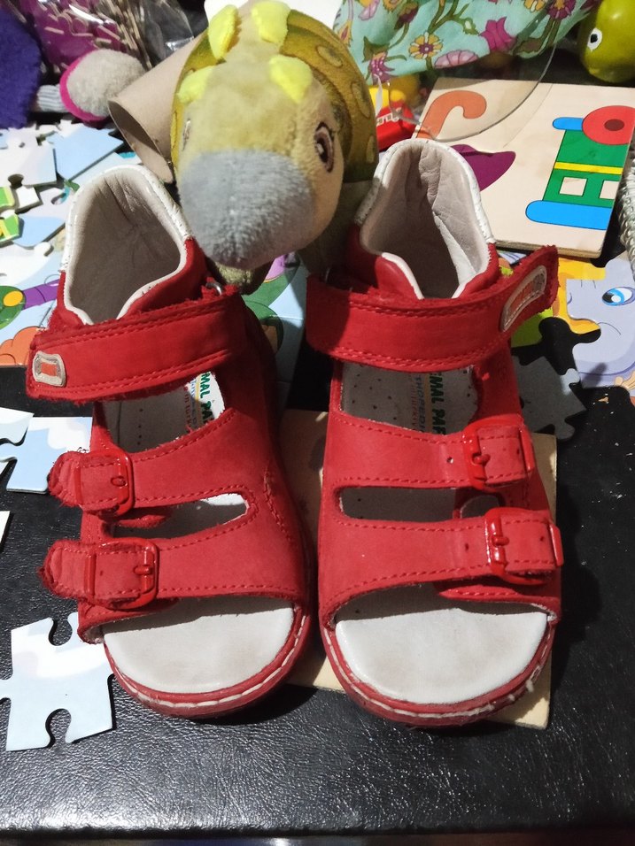 Kemerli, kırmızı renkte, lastik tabanlı erkek çocuk ilk adım ayakkabısı. Modaya uygun ve özgün bir tasarıma sahip.