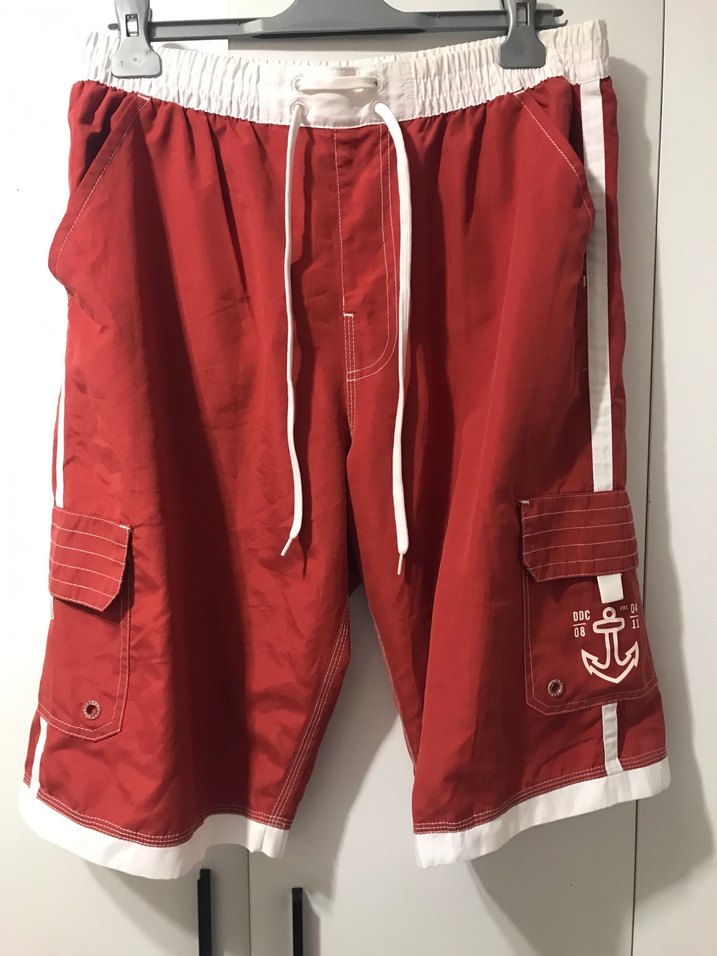 Kemerli bel ve yan cepleriyle kırmızı erkek midi deniz şortu. Rahat kesim, beyaz şerit detaylı, plaj ve günlük sokak stili için uygun.