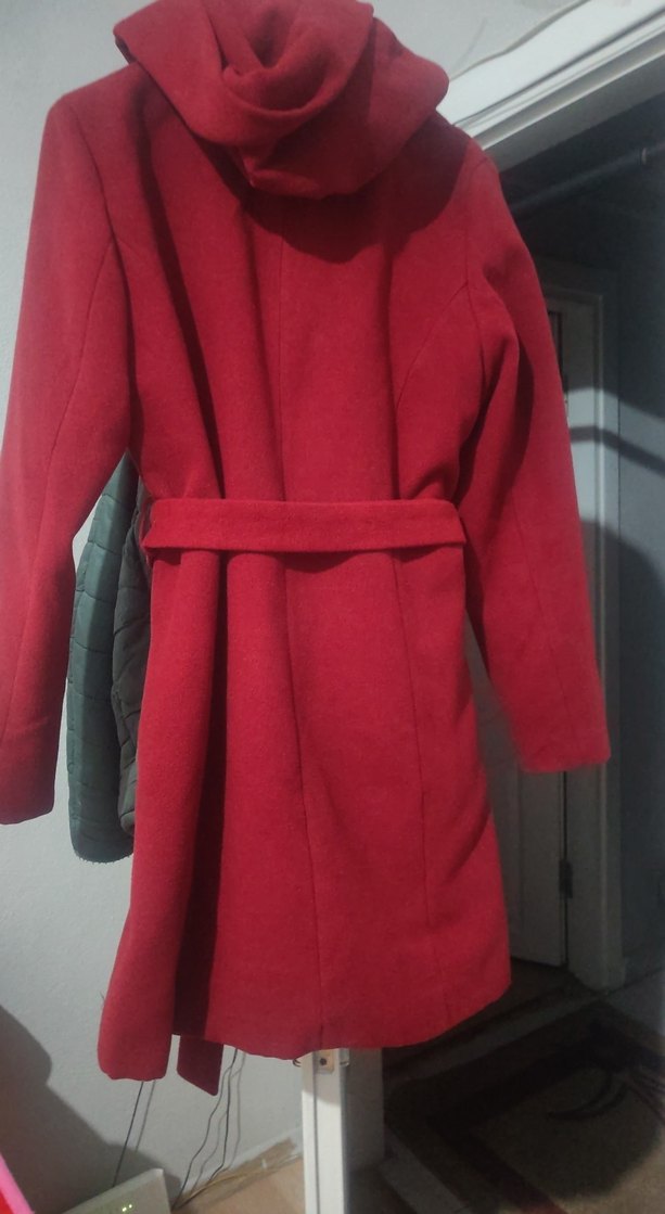 Kemerli, kırmızı, diz boyu, uzun kollu,kapışonlu ve sade tasarımlı, günlük kullanıma uygun rahat ve şık kadın kabanı.