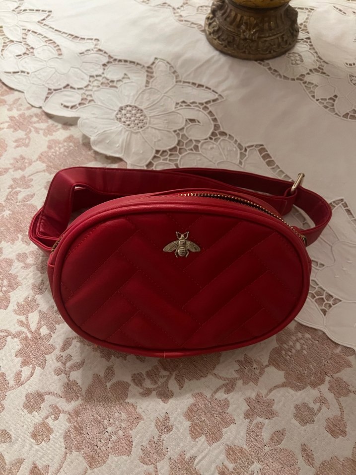 Parlak kırmızı deri kadın çapraz çanta, kemerli ve işlemeli desenli. Küçük metal arı detayı bulunur, günlük kullanım için uygundur.