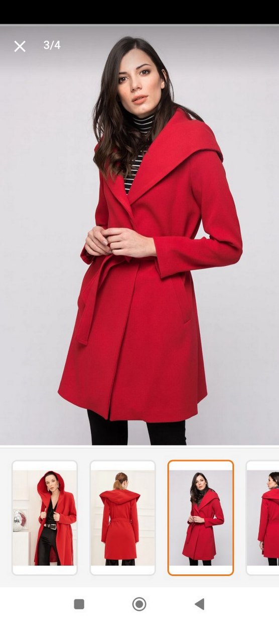 Kemerli, geniş yakalı kırmızı kadın kaban. Orta uzunlukta, modern ve şık tasarıma sahip. Soğuk günler için ideal.