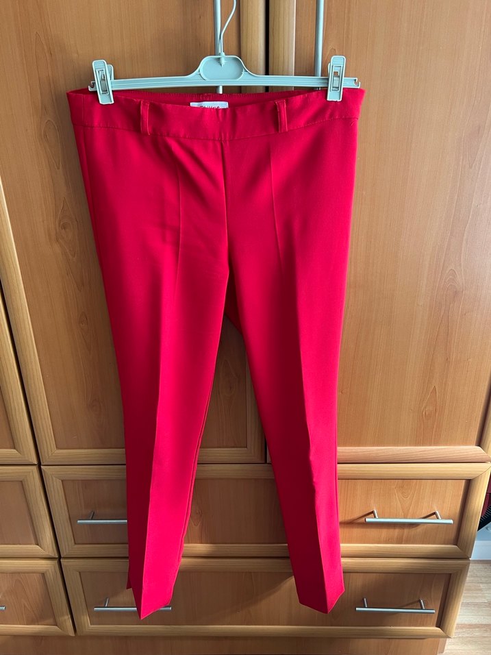 Kemerli, düz kesim ve midi boyda kırmızı kadın kumaş pantolon. Ofis için uygun
