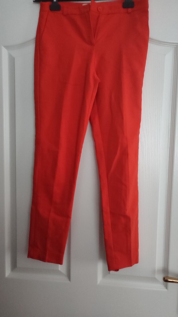 Kemerli, midi boy, kırmızı kadın kumaş pantolon. sentetik kumaştan, normal kesim ve desensiz, ofis için uygun. Aslında tam kırmızı değil hafif turuncuya kaçıyor en 32 boy 86