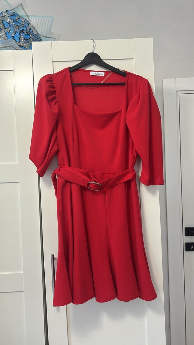 Kemerli, parlak kırmızı midi elbise, tek renk, modern klasik tarzda, kare yaka . Romantik akşamlar için uygun. Kemer kısmı hafif paslanmış ancak belli olmuyor bir kere giyildi diz üstü orta derecede esnek kumaş