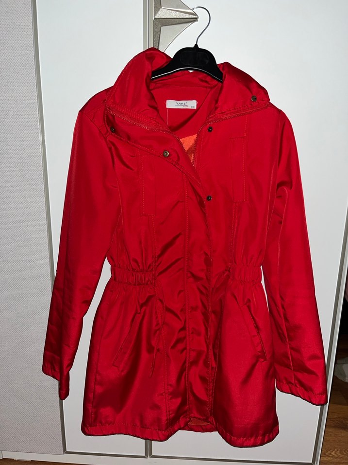 Parlak kırmızı renkte, kemerli ve oturan kesime sahip midi uzunlukta yağmurluk. Uzun kollu ve yakası kesik detaylı, minimalist ve şık tasarım. ️