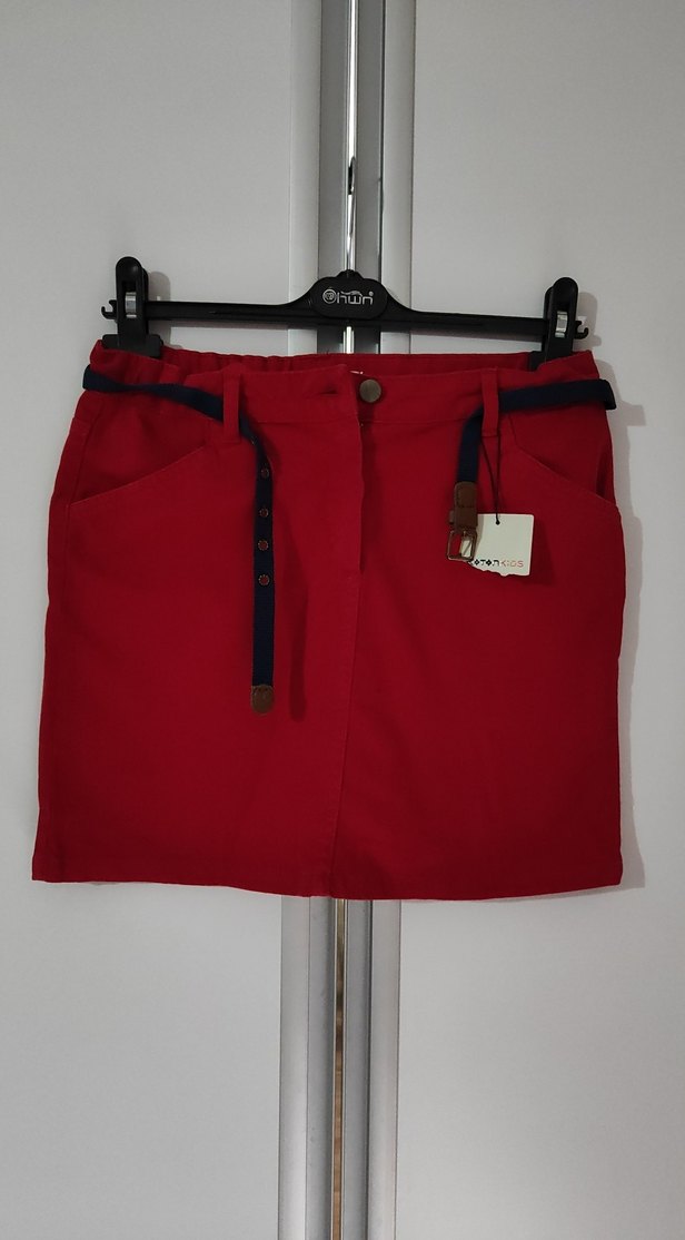 Kemerli Kırmızı Mini kot Etek