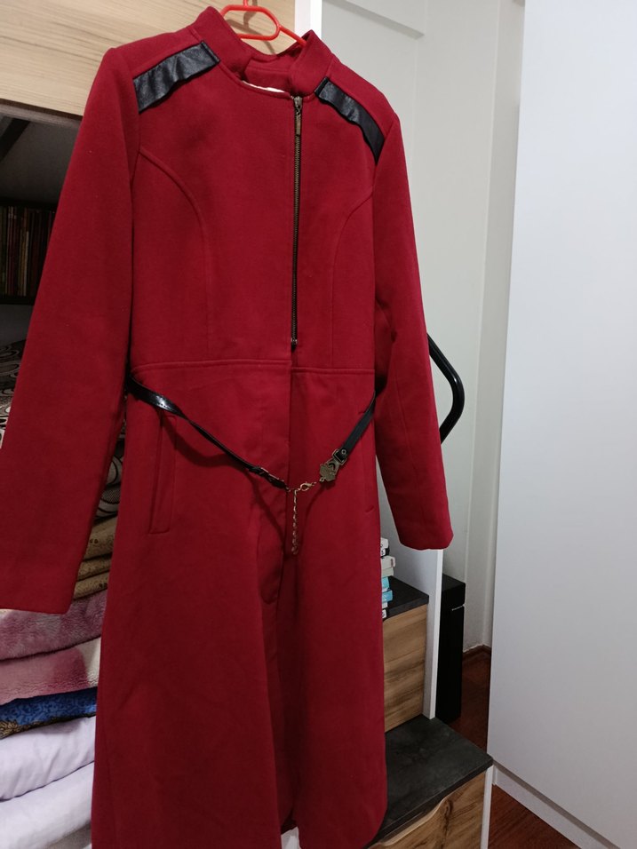 Kemerli bel ve siyah detaylı omuzlarıyla kırmızı süet, uzun ve vücuda oturan kadın kaban. Uzun kollu, desen içermeyen şehir stili için uygun.