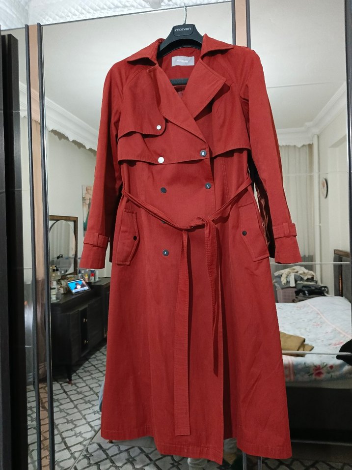 Kemerli, yakalı ve kiremit rengi trençkot, normal kesimi ve askılı kollarıyla şık ve rahat bir sokak stili sunar.