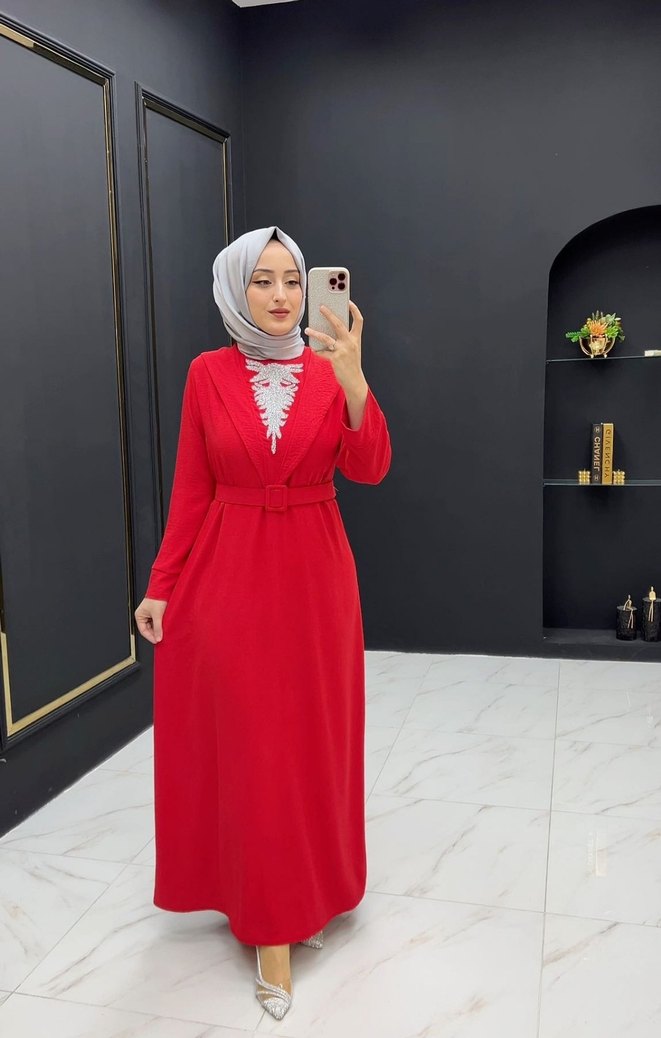 Kemerli Kırmızı Taş Detaylı Uzun Elbise