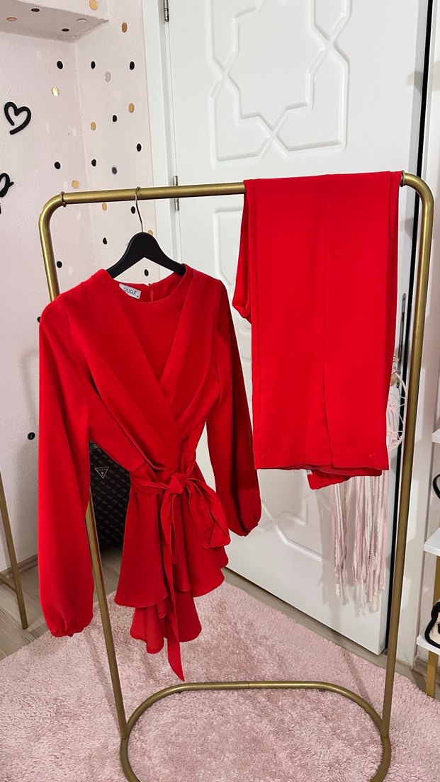 Kemerli Kırmızı Uzun Kollu Alt üst takım