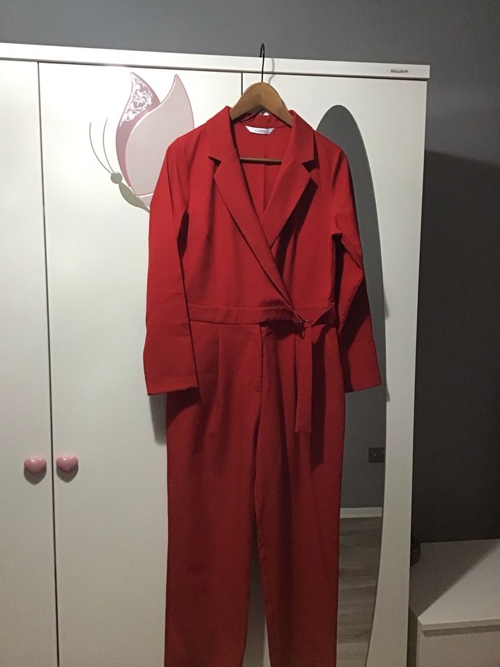 Kırmızı renkli, kemerli, normal kesim tulum. Uzun kollu ve yakası kesimli, minimal tarzda, ofis için uygun midi boyda, desensiz sentetik kumaştan yapılmıştır.