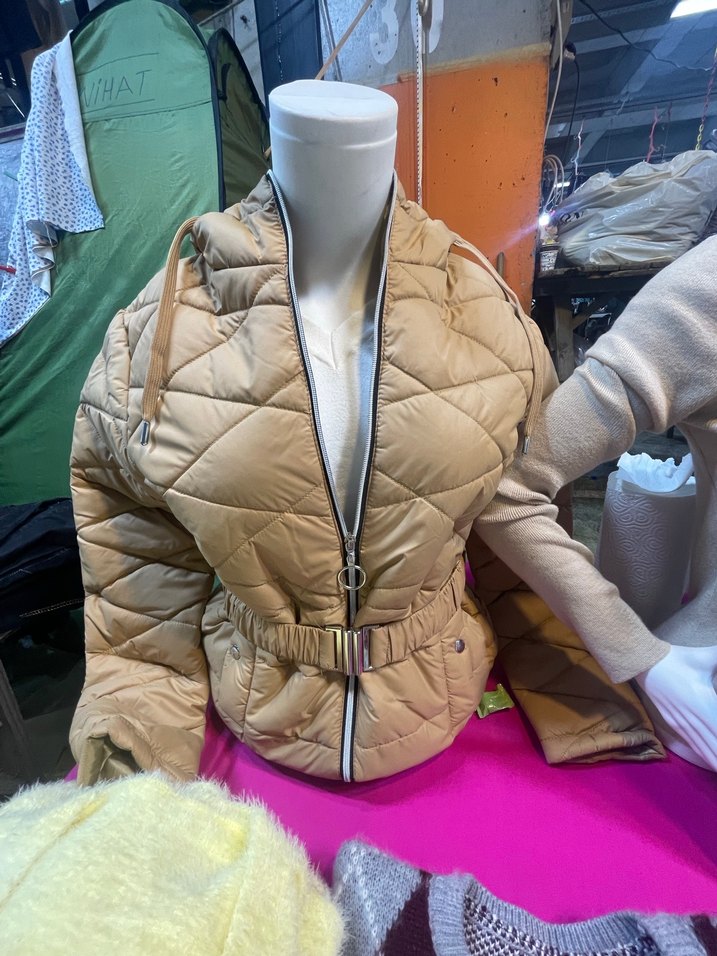 Kemerli ve yüksek yakalı, kısa kesim bej kadın mont. Yumuşak sentetik kumaştan, strappy kollu ve rahat bir tarz sunar. Trendy günlük kullanıma uygun.