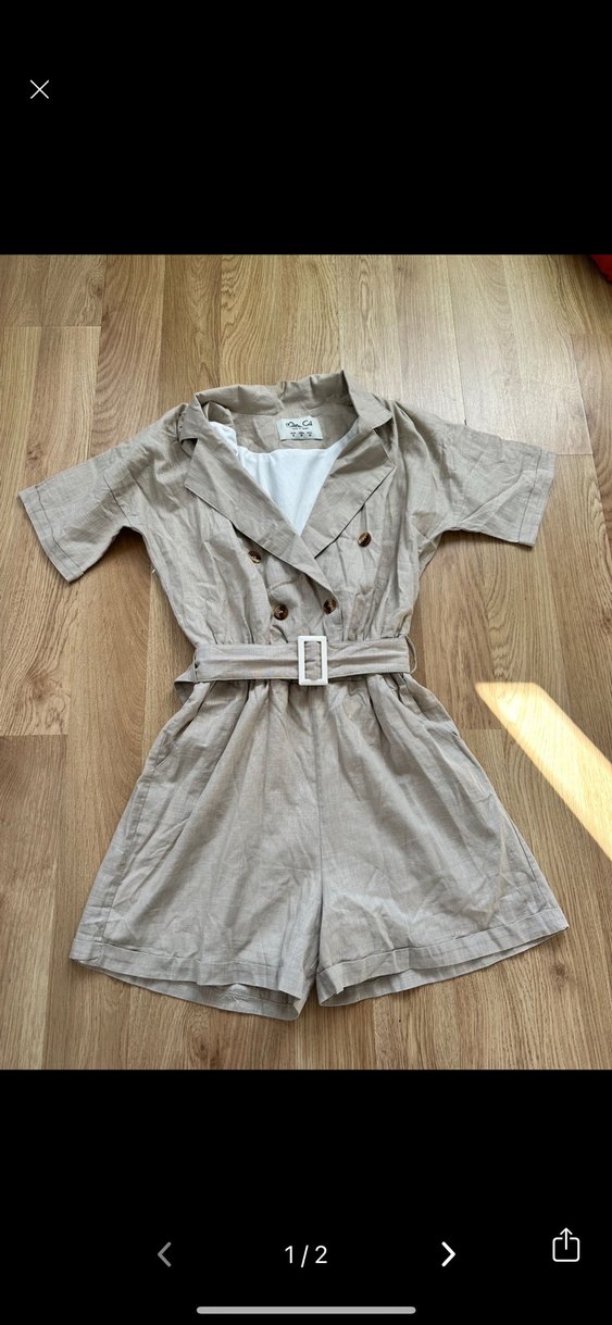 Bej renkli keten kumaştan, kısa kollu ve kemerli, bol kesim tulum. Notlu yaka detayıyla günlük sokak stiline uygun.