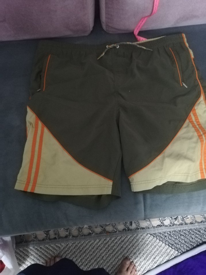 sentetik kumaştan, kemerli ve turuncu detaylı, erkek şort. Sokak stili ve açık hava kullanımı için uygundur.