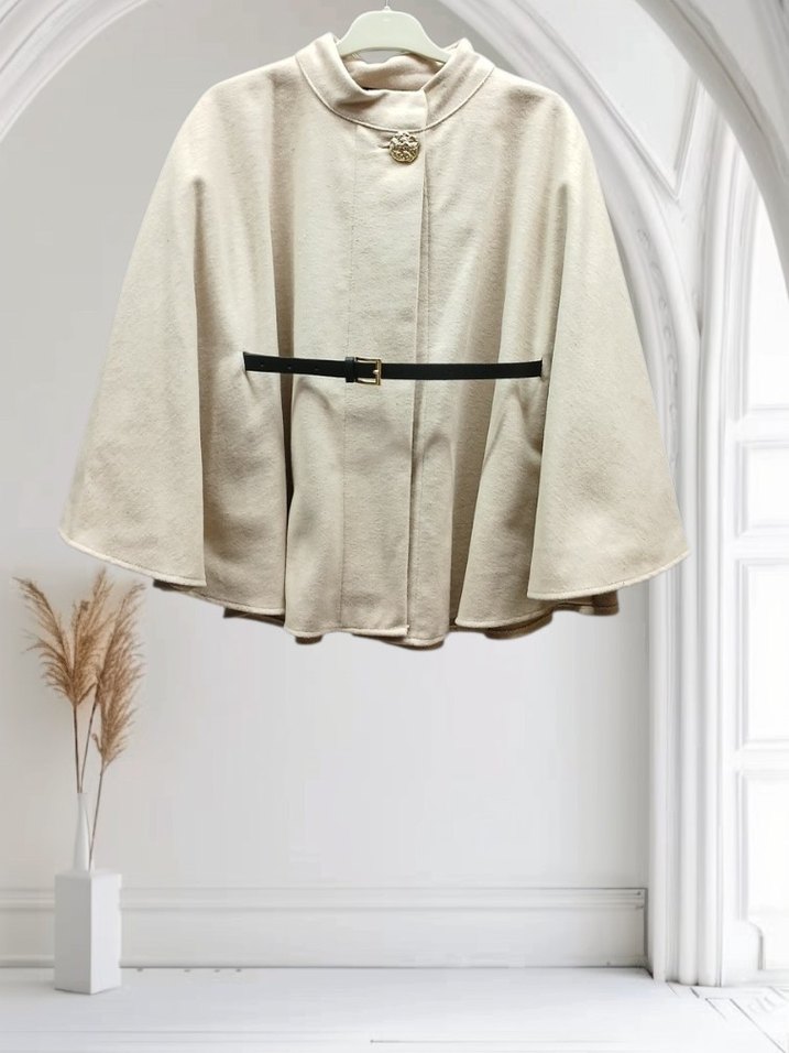 Beyaz kısa boy kadın panço, yumuşak sentetik kumaştan, uzun kollu ve kemerli, notched lapel yakalıdır. Rahat kesimiyle günlük şehir şıklığı sunar.