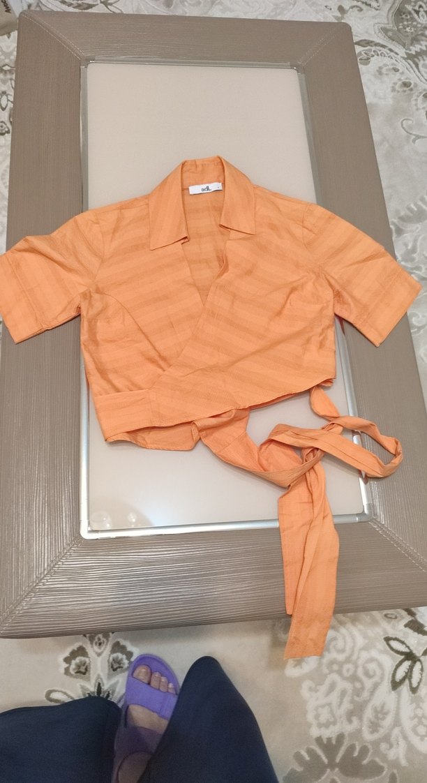 Pastel bej keten gömlek, yakalı, kısa kollu, bol kesim ve kemerli. Trendy günlük kullanım için uygundur.