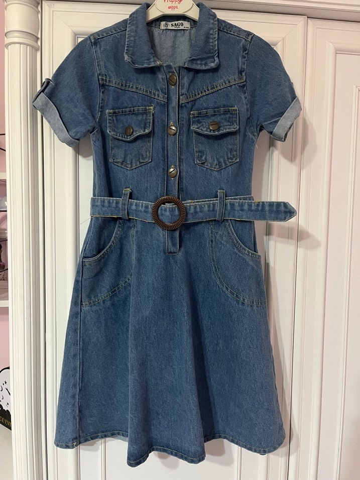 Kemerli Kısa Kollu Kot Elbise 8 yaş